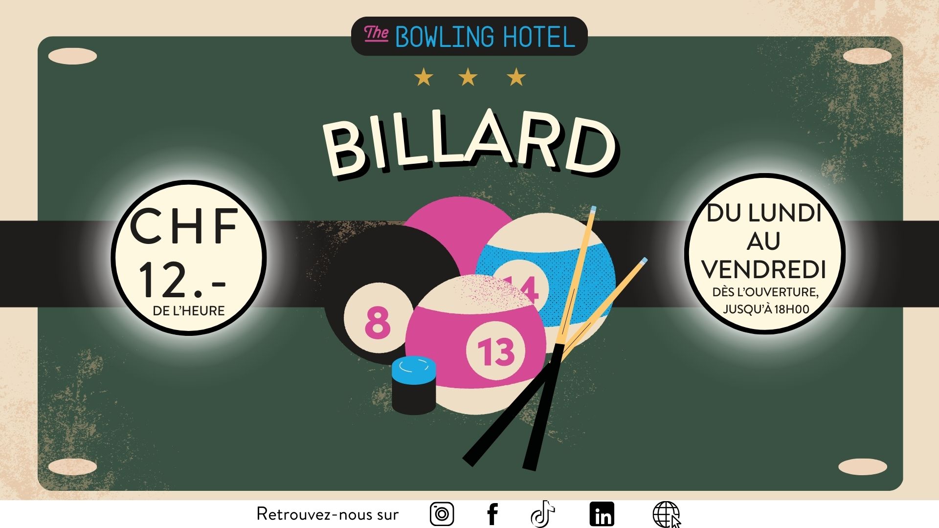 LUNDI AU VENDREDI À PARTIR DE 18:00 // SAMEDI ET DIMANCHE : 20.–/HEURE